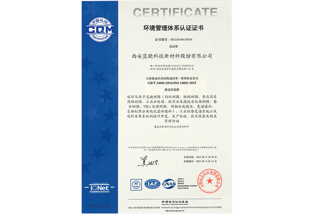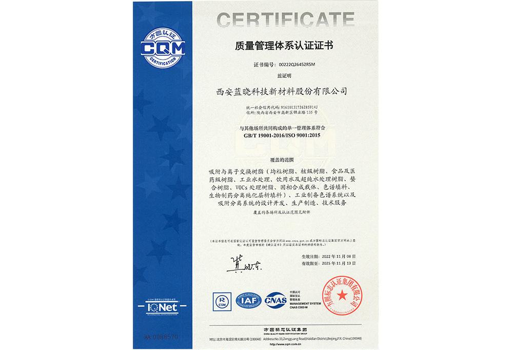 藍曉科技在核心材料創(chuàng)新、新興應(yīng)用領(lǐng)域拓展、專業(yè)化銷售與服務(wù)等方面具有綜合的技術(shù)優(yōu)勢,核心技術(shù)全部為自主知識產(chǎn)權(quán),擁有中國專利59 項,其中發(fā)明專利50項,以及國際專利授權(quán)6項。2次榮獲國家科技進步二等獎,完成科技部創(chuàng)新基金2項,獲得國家重點新產(chǎn)品3項。藍曉科技先后通過GB/T 19001-2016/ISO 9001:2015 質(zhì)量管理體系認證和GB/T 24001-2016/ISO14001:2015 環(huán)境管理體系認證、GB/T 45001-2020/ISO 45001:2018職業(yè)健康安全管理體系認證、GB/T 23331-2020/ISO 50001:2018能源管理體系認證、GB/T23001-2017信息化和工業(yè)化融合管理體系,并擁有WQA金印、Kosher、FDA注冊、CE、REACH等國際資質(zhì),確保向客戶提供優(yōu)質(zhì)穩(wěn)定的產(chǎn)品。公司生產(chǎn)的吸附分離材料包括30多個系列100多個品種,廣泛用于食品、制藥、植物提取、離子膜燒堿、環(huán)保、化工催化、濕法冶金、水處理等工業(yè)領(lǐng)域,市場覆蓋全球100多個國家。